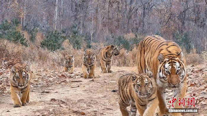中新社长春12月26日电 (记者 郭佳)记者26日从东北虎豹国家公园管理局获悉,今年11月8日,在公园的珲春片区监测到一只雌性野生东北虎带领五只幼崽出现,这是中国首次拍到“六虎同框”影像。