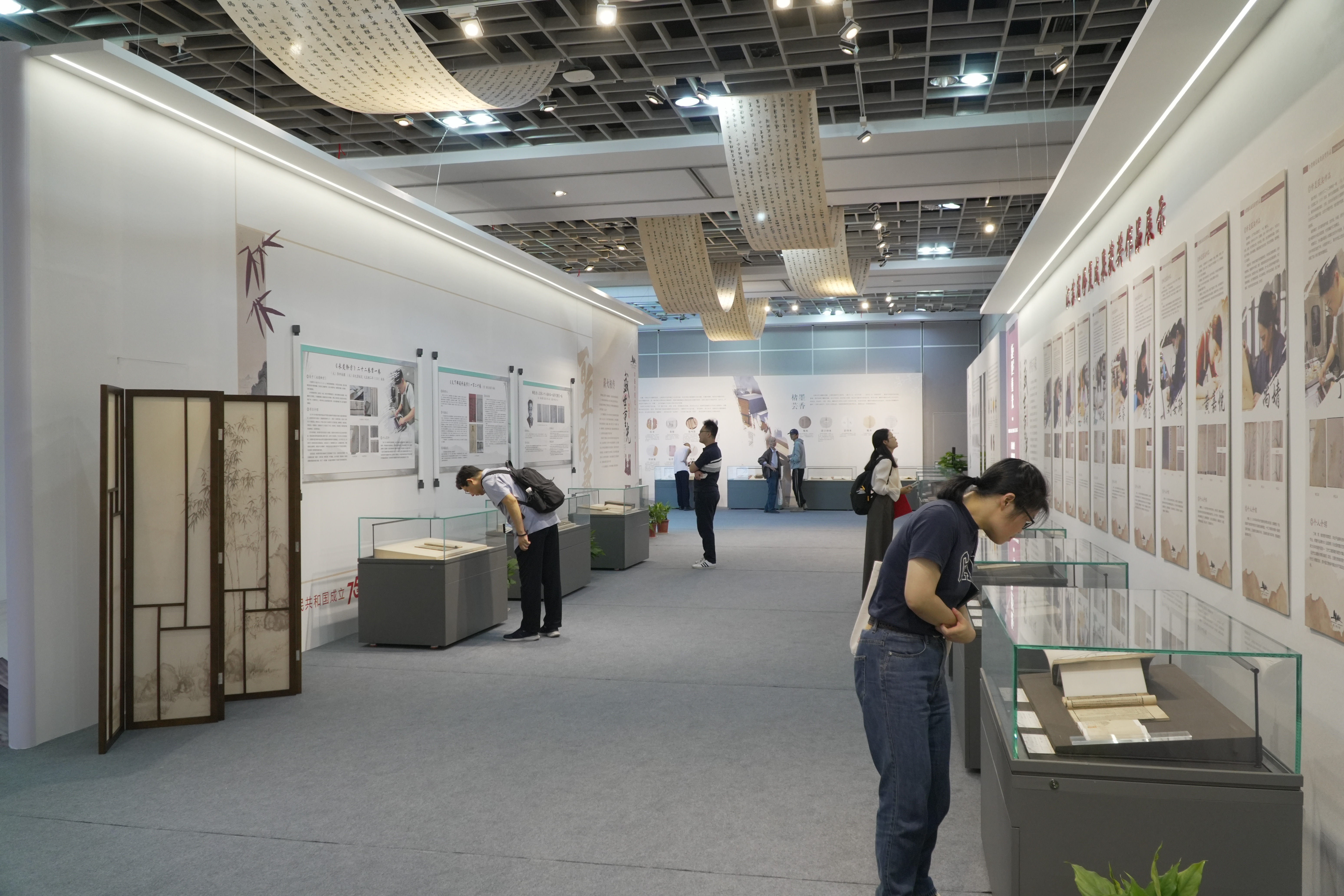 展厅内还搭建了一间“古籍修复室”,陈列展示修复工具、用纸、染色材料等传统用具,压力机、纸张纤维仪等现代化修复设备。展厅还设有互动区,开展流沙笺制作、雕版刷印、活字刷印、古籍订线等体验活动。