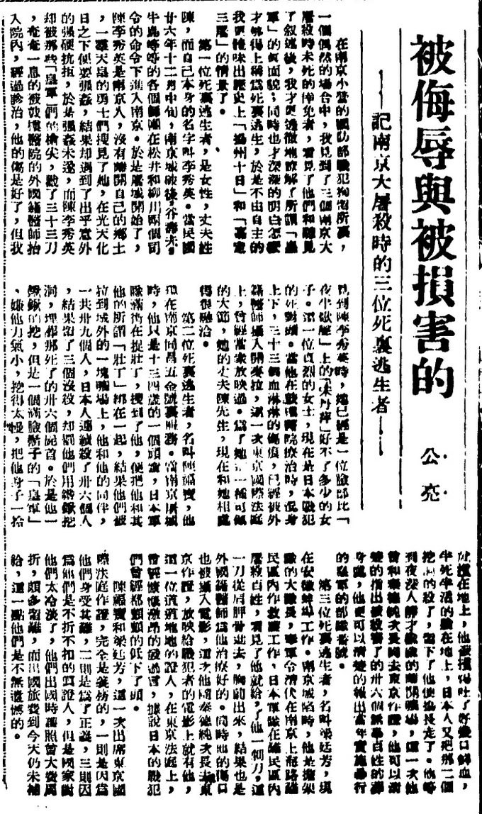 直至抗战胜利后,中国记者才有机会全面报道南京大屠杀惨案,以及对谷寿夫等大屠杀罪魁的“南京审判”。