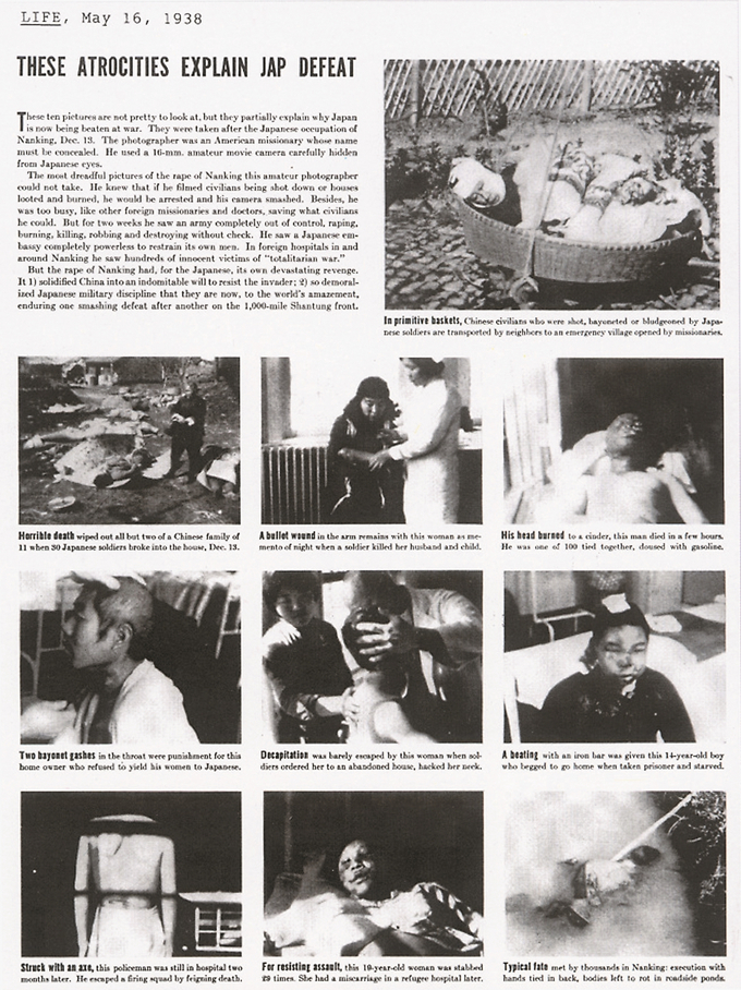 相较于文字,新闻图片更能直观还原大屠杀现场。当地时间1938年1月10日,美国芝加哥《生活》画报以《关于攻掠南京的纪事和照片》为题,刊登了两组南京大屠杀新闻照片,这是西方报纸首次刊发相关影像。