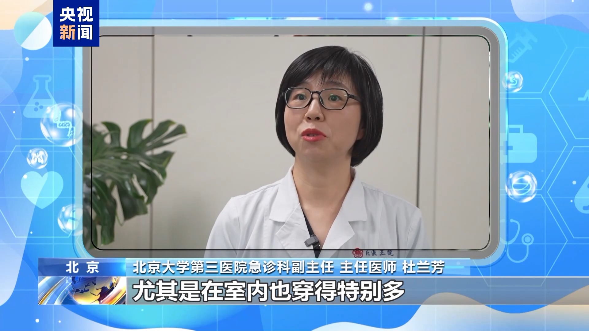 北京大学第三医院急诊科副主任 主任医师 杜兰芳:冬季的环境温度低,怕着凉,所以穿得特别多,尤其是在室内也穿得特别多,而且没有通风,这种情况下可能会发生热射病。
