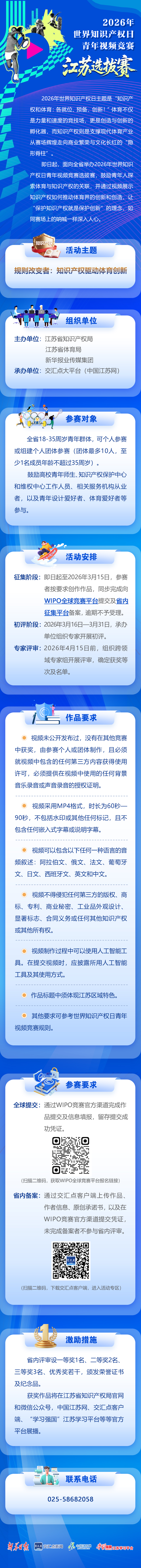 即日起,面向江苏全省举办2026年世界知识产权日青年视频竞赛选拔赛,鼓励青年人探索体育与知识产权的关联,并通过视频展示知识产权如何推动体育界的创新和创造,让“保护知识产权就是保护创新”的理念,如同赛场上的呐喊一样深入人心。