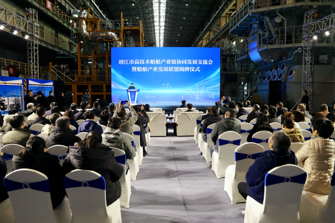 交汇点讯 1月28日,为加速产业链上下游协同创新与深度融合,实现国船国造、国船国配,江苏省工信厅联合靖江市在靖江经济技术开发区举行船舶产业链协同发展交流会暨船舶产业发展联盟揭牌仪式,进一步凝聚产业发展合力,推动总装建造企业与配套企业“抱团取暖、协同共进”。