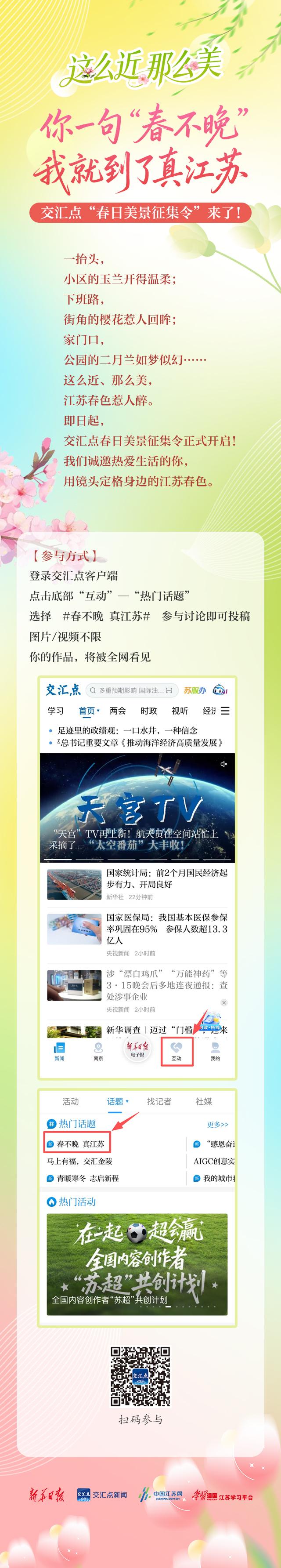 登录交汇点客户端,点击底部“互动”—“热门话题”,选择#春不晚 真江苏#话题,即可参与讨论。