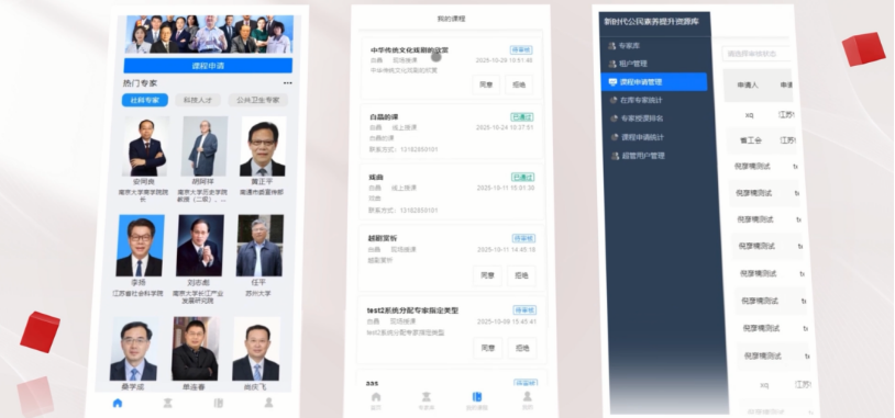 资源库的核心特色在于构建了“用户—师资—管理”三端联动的全流程线上闭环服务体系。用户登录平台后,可在线浏览师资信息、一键提交学习需求。平台智能匹配系统根据课程主题与专家研究方向,自动筛选适配师资并实时推送邀约。从需求申报、内容确认到服务反馈,所有环节均在线上完成,省去了传统模式下的沟通成本与奔波劳顿,服务周期大幅缩短,真正实现“线上办事、省心高效”。