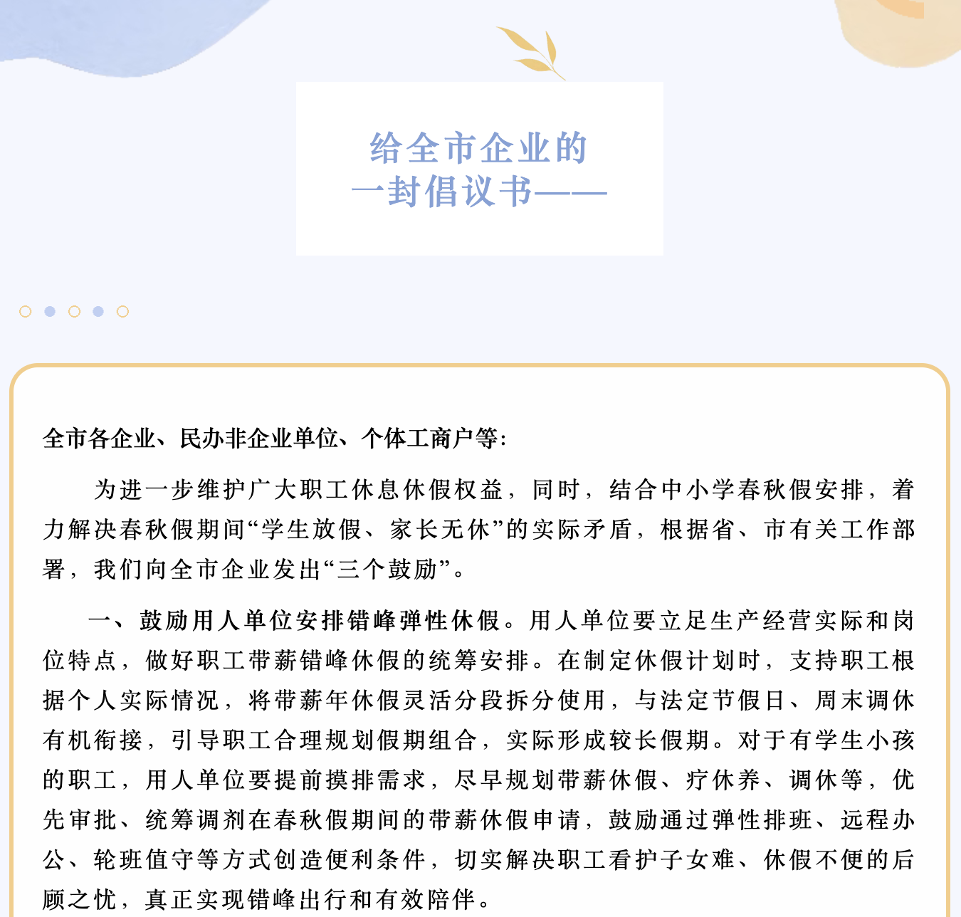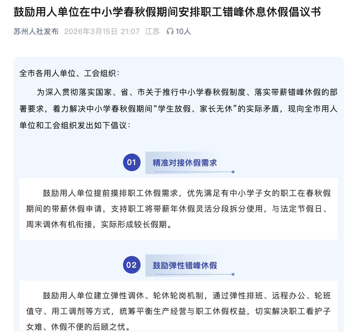 3月15日,苏州市人社局、苏州市总工会联合发布倡议书:鼓励用人单位在中小学春秋假期间,安排职工错峰休息休假。《鼓励用人单位在中小学春秋假期间安排职工错峰休息休假倡议书》中,提出六项措施: