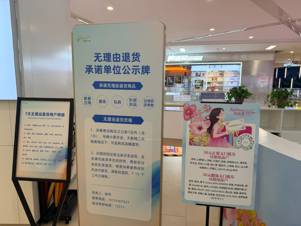 3月12日上午,镇江市苏宁广场,玻璃幕墙折射出春日的暖光。推开门,一楼大厅最显眼的位置,“7天无理由退货商户明细”“无理由退货承诺单位公示牌”静静伫立——这是苏宁广场送给每位顾客的第一份安心。