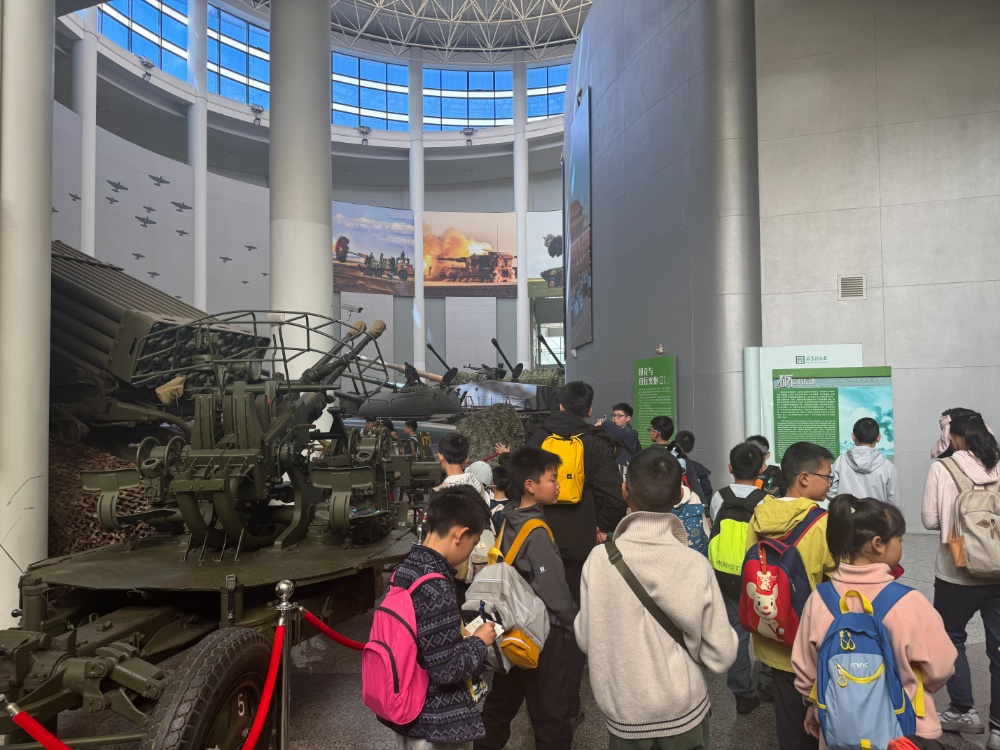 “这是博福斯式75mm山炮,这架火炮的生产企业创始人,就是大名鼎鼎的诺贝尔先生!这款火炮参加了抗日战争中的南京保卫战,是中国人民抵抗日本侵略的重要武器之一……”进入场馆后,只见前来参观的中小学生们正仔细地听讲解员介绍,不少同学拿出小本子记录,或者用电话手表拍照。