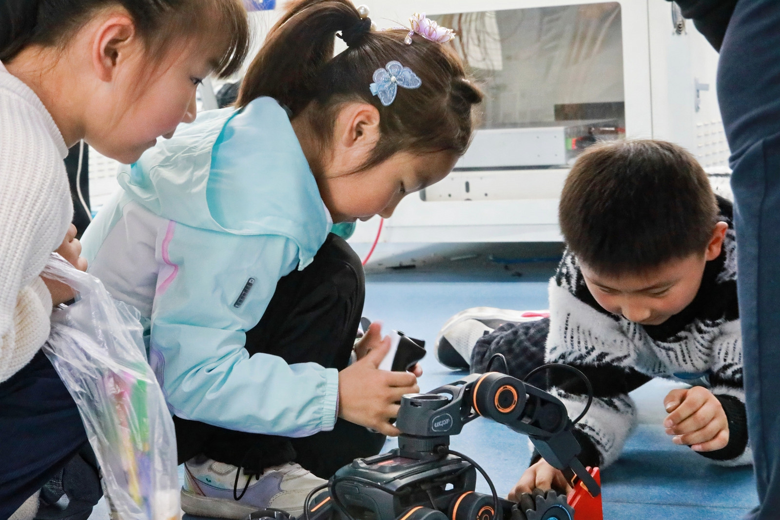 在南京工业大学的篮球场内,一群小学生们正在“围观”机器人。原来,该校电气工程与控制科学学院大三学生白一廷正向小朋友们讲解步兵机器人的构造。讲解结束后,孩子们也开始排队摆弄这台“大玩具”。南京工业大学实验小学三年级的邓同学兴奋地操控着一台机器人快速移动,他停下来指着机器人上贴的姓名贴说:“将来,我也想做一台属于自己的机器人!”